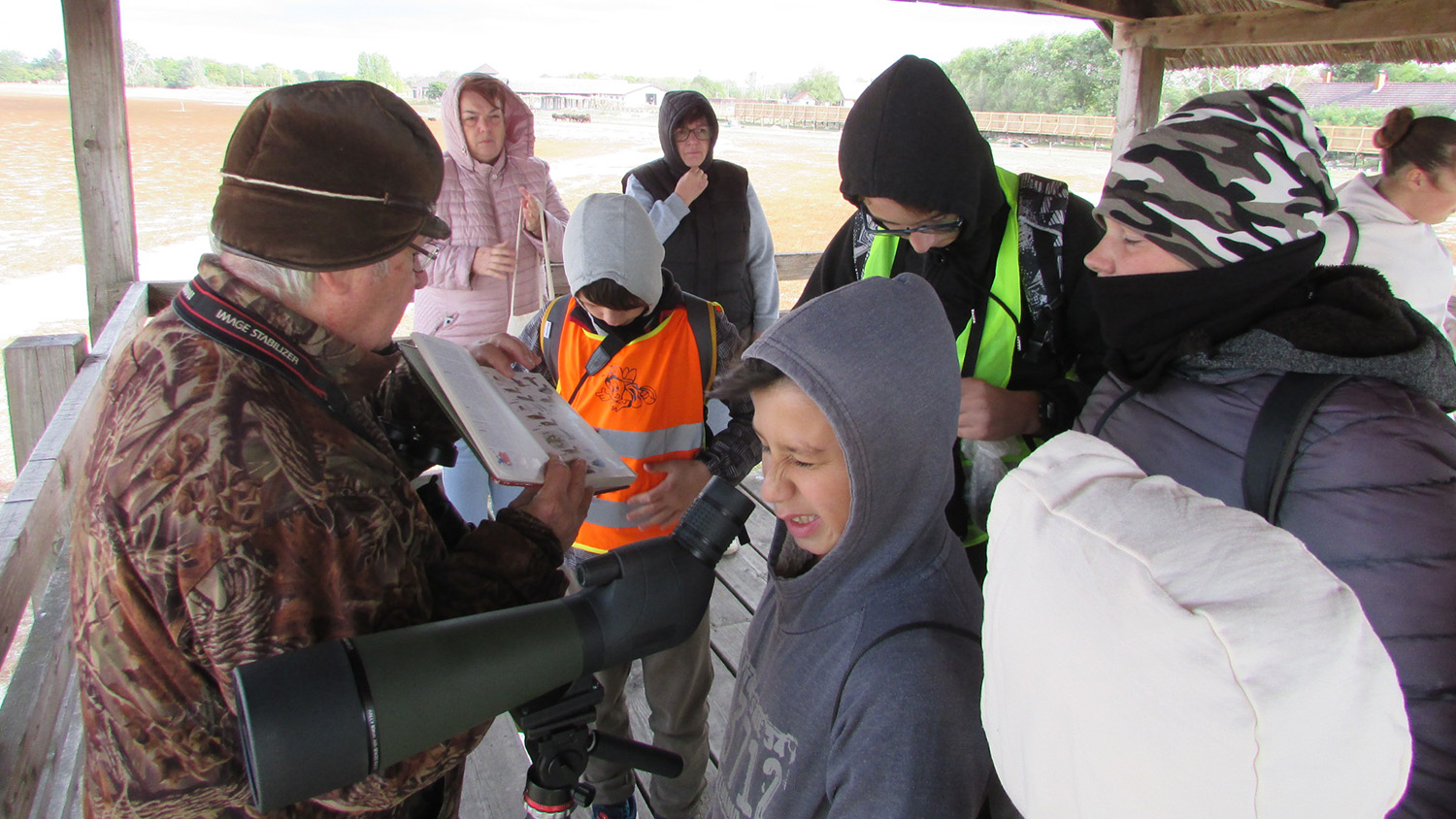 Kibicikliztünk a Nagyszéksós-tóhoz, ahol a kilátóban dr. Molnár Gyula ornitológus mesélt a kiszáradó szikes tó életciklusairól, miközben a csatornában látható, távcsövekkel „közelre hozott” madarakban gyönyörködtünk. Köszönjük a program létrejöttét a Kapocs Népfőiskolának, Kovács-Tanács Istvánnénak és Makra Emőke tanárnőnek.