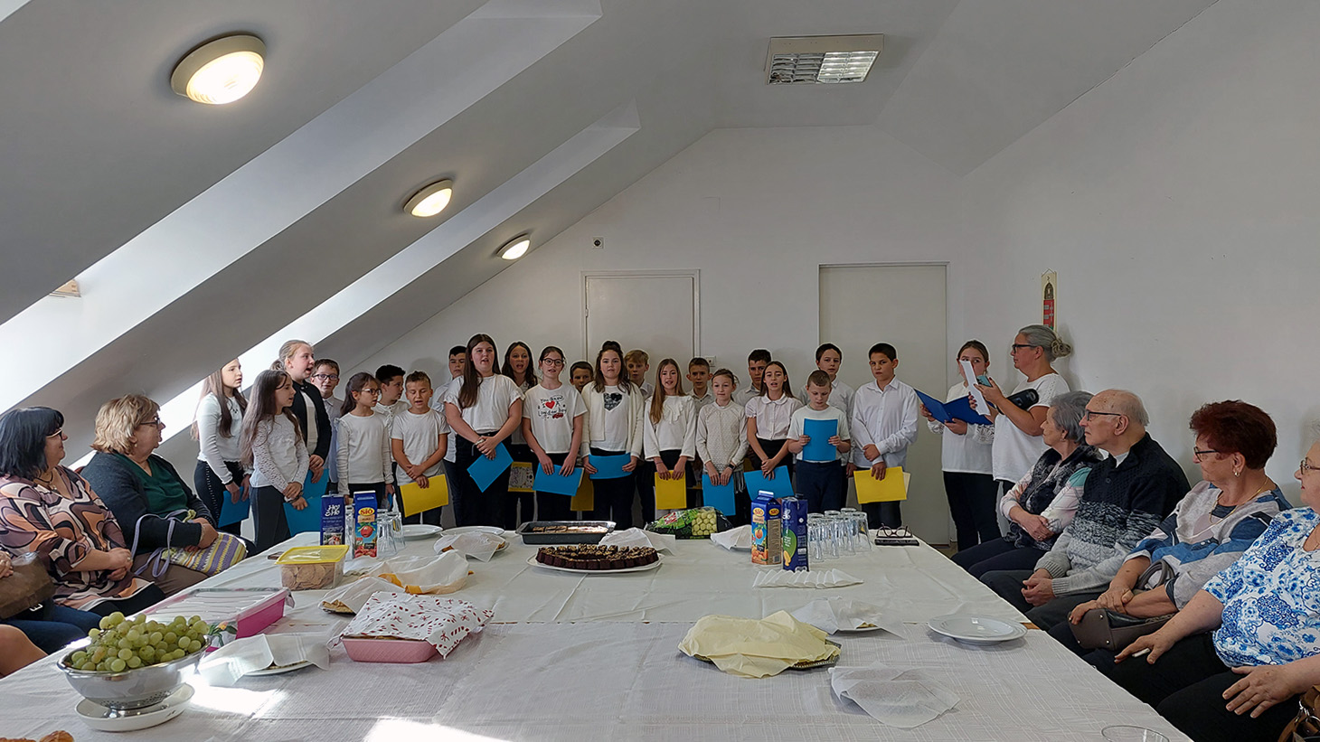 . Az 5.a osztály tanulói Szaniszlóné Hargitai Eszter osztályfőnökkel egy kedves, megható műsorral köszöntötte őket.