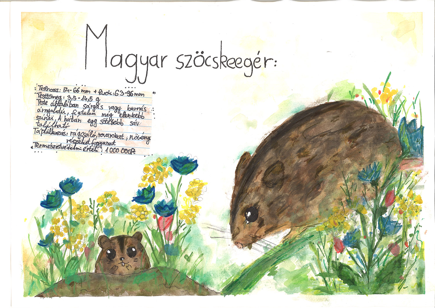 Az első fordulóban a 2025-ös év élőlényeiről kellett online feladatlapot kitölteni, ami a tanulók elfoglaltsága miatt kicsit nehezen jött össze, de teljesítményük alapján bekerültek a csapatot a jelenléti fordulóra, ahová egy 2025-ös év élőlényét bemutató plakátot is kellett készíteni. Kornélia a csapat „festőművésze”, azonnal tudta, hogy az év emlősét, a magyar szöcskeegeret szeretné a plakáton megjeleníteni. Természetesen nemcsak a festménnyel készültünk, hanem környezetünk fafajainak, terméseinek, környezetünk állatainak és azok koponyájának valamint madarainak felelevenítése is megtörtént.