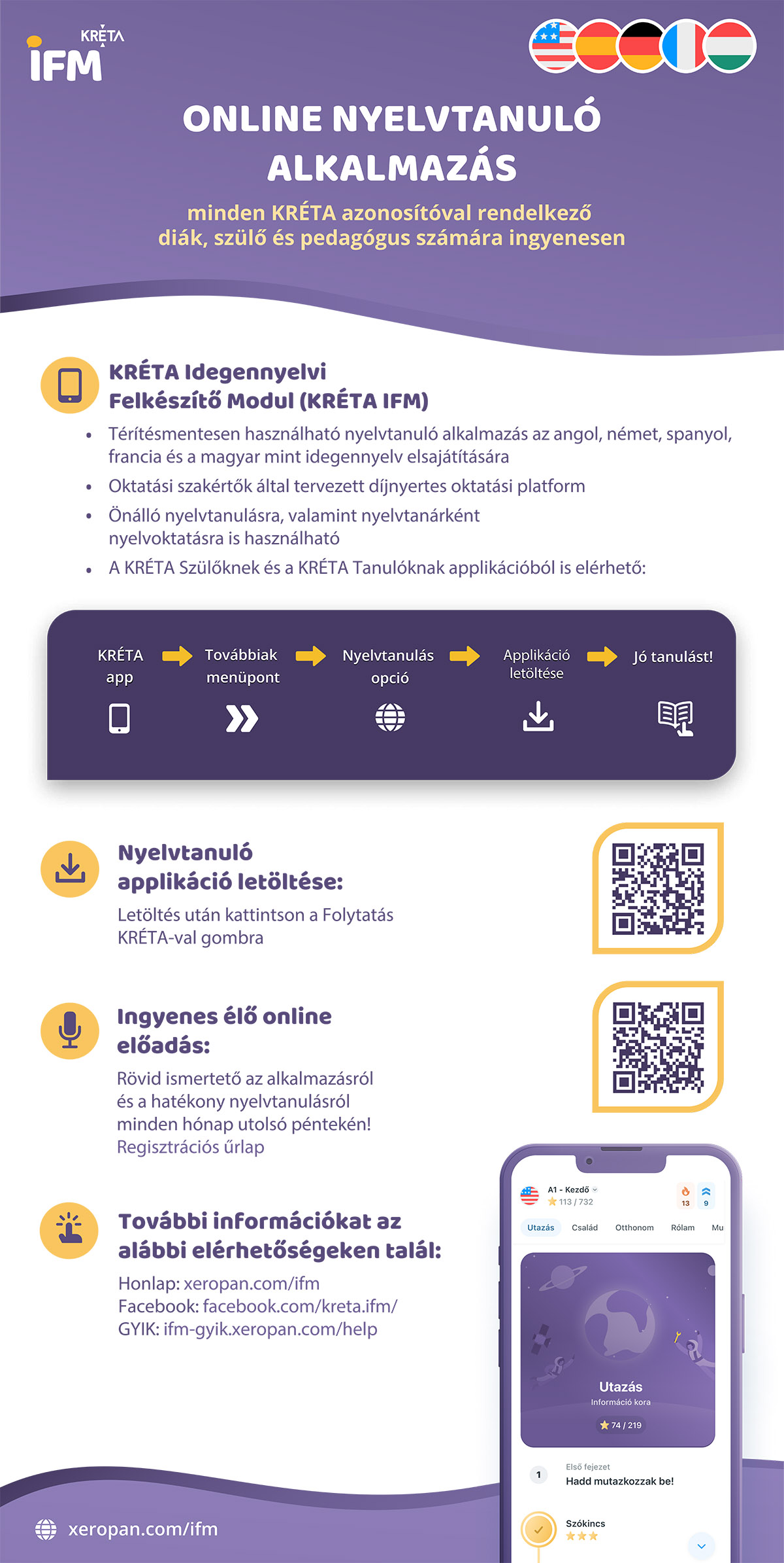 A KRÉTA Idegennyelvi Felkészítő Modulról (IFM) egy rövid bemutató videó készült a szülők számára, amelyben a Modul szakmai vezetője ismerteti az alkalmazás előnyeit és felhasználási lehetőségeit. Az alkalmazás használatáról 2026 januárjától havi rendszerességgel online előadásokat szerveznek a szülők és gondviselők részére. Minden KRÉTA azonosítóval rendelkező diák, szülő és pedagógus számára ingyenesen elérhető az alkalmazás.