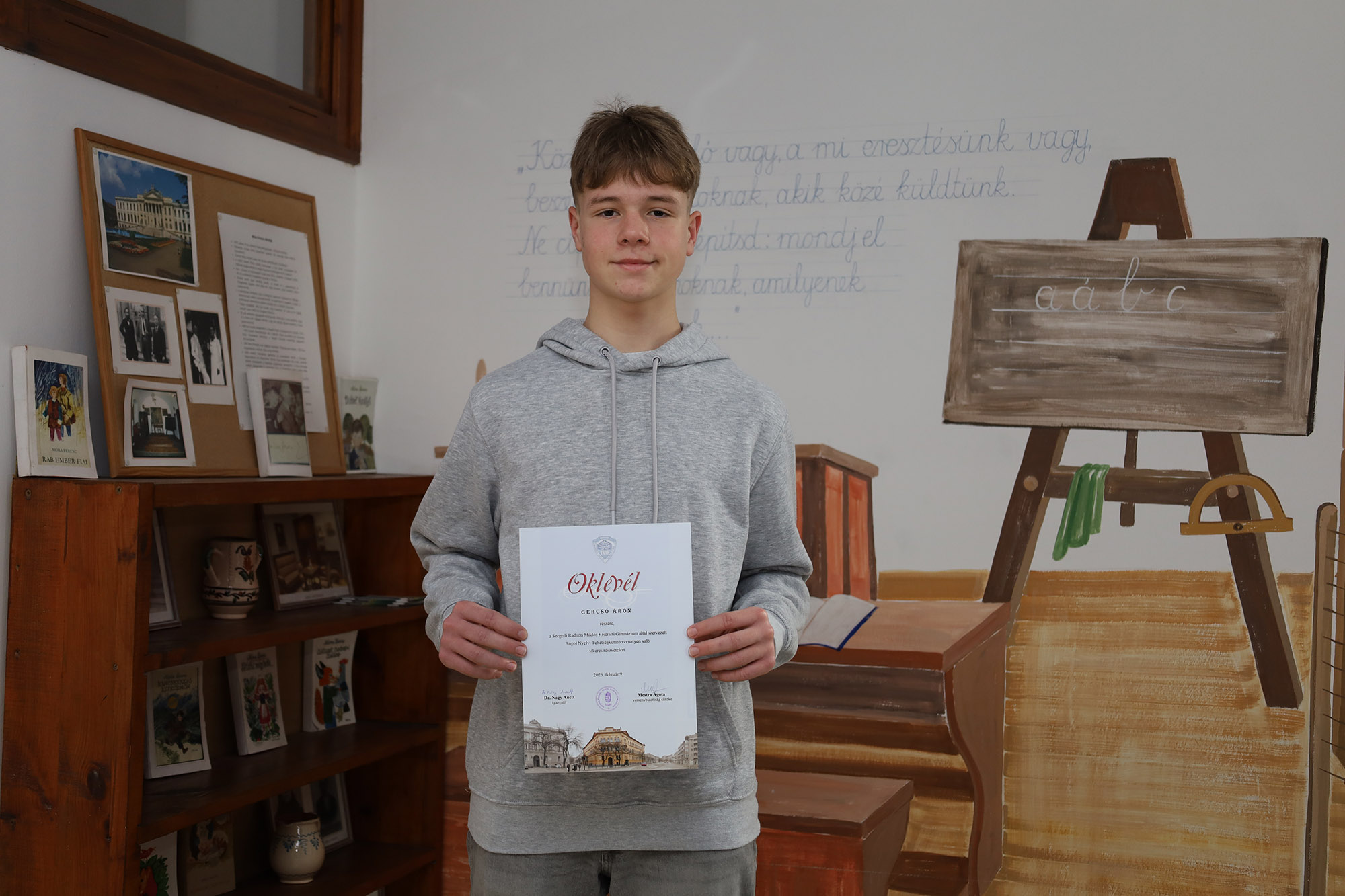 Iskolánkból Gercsó Áron 8.b osztályos tanuló ért el kiváló eredményt ezen a versenyen. Az első és a második forduló írásbeli feladatait teljesítve a harmadik fordulóba jutott be, ahol szóbeli tudását bizonyította az oda bejutó legjobb nyolc versenyző között a saját (a nem anyanyelvi beszélők) kategóriájában.